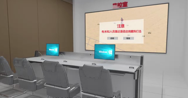 霧陣系統(tǒng)在雷視預(yù)警系統(tǒng)發(fā)現(xiàn)可疑目標(biāo)是就已經(jīng)自動上電準(zhǔn)備,可疑人員繼續(xù)接近隔離網(wǎng)并有破壞行為時(shí),中控室就彈屏請示是否打擊