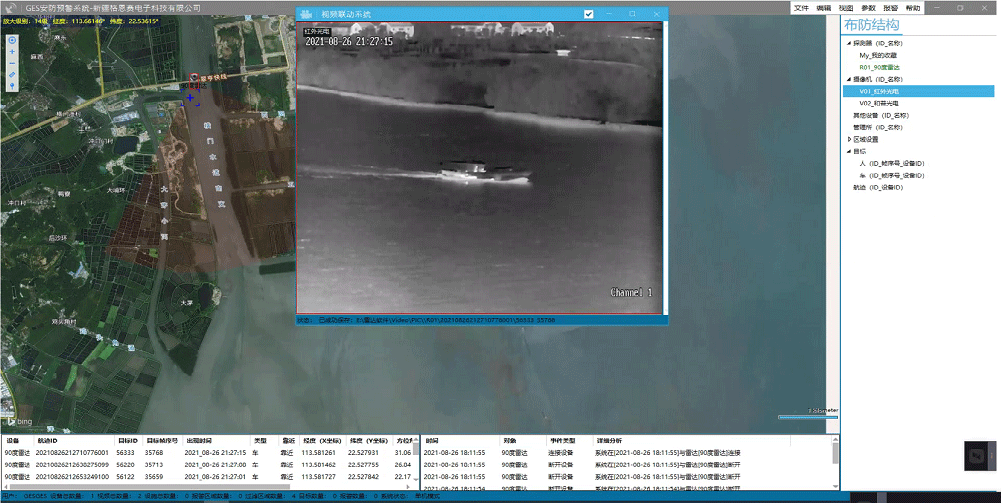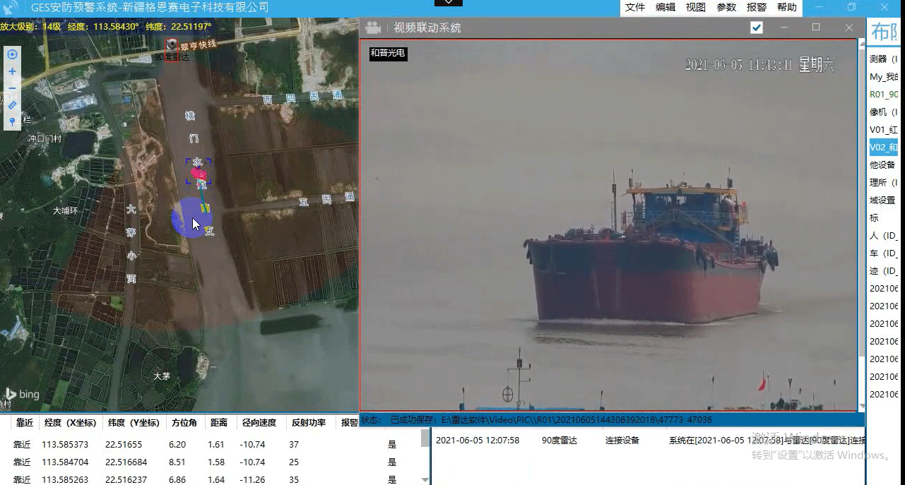 廣州某地水域,因水面監(jiān)控需求,在某河道安裝GES-D90-1000型雷達(dá)1臺(tái)、攝像機(jī)1臺(tái),通過網(wǎng)絡(luò)傳輸至監(jiān)控中心,形成雷達(dá)安防預(yù)警系統(tǒng),對(duì)河道往來船只進(jìn)行監(jiān)控。